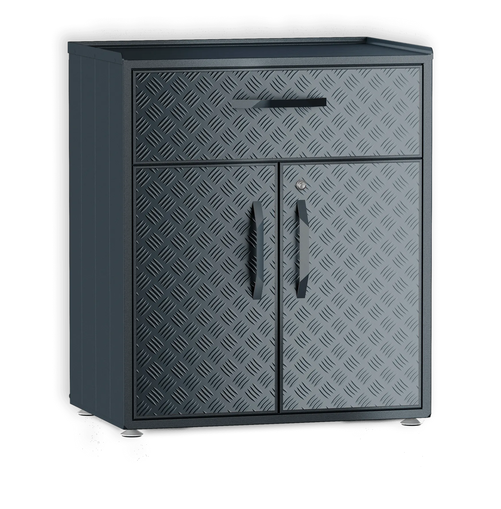 Шкаф из алюминия с ящиком. Специально разработан для любых погодных условий. Внутренняя полка регулируется по высоте. Ящик с доводчиками для плавного бесшумного закрытия.