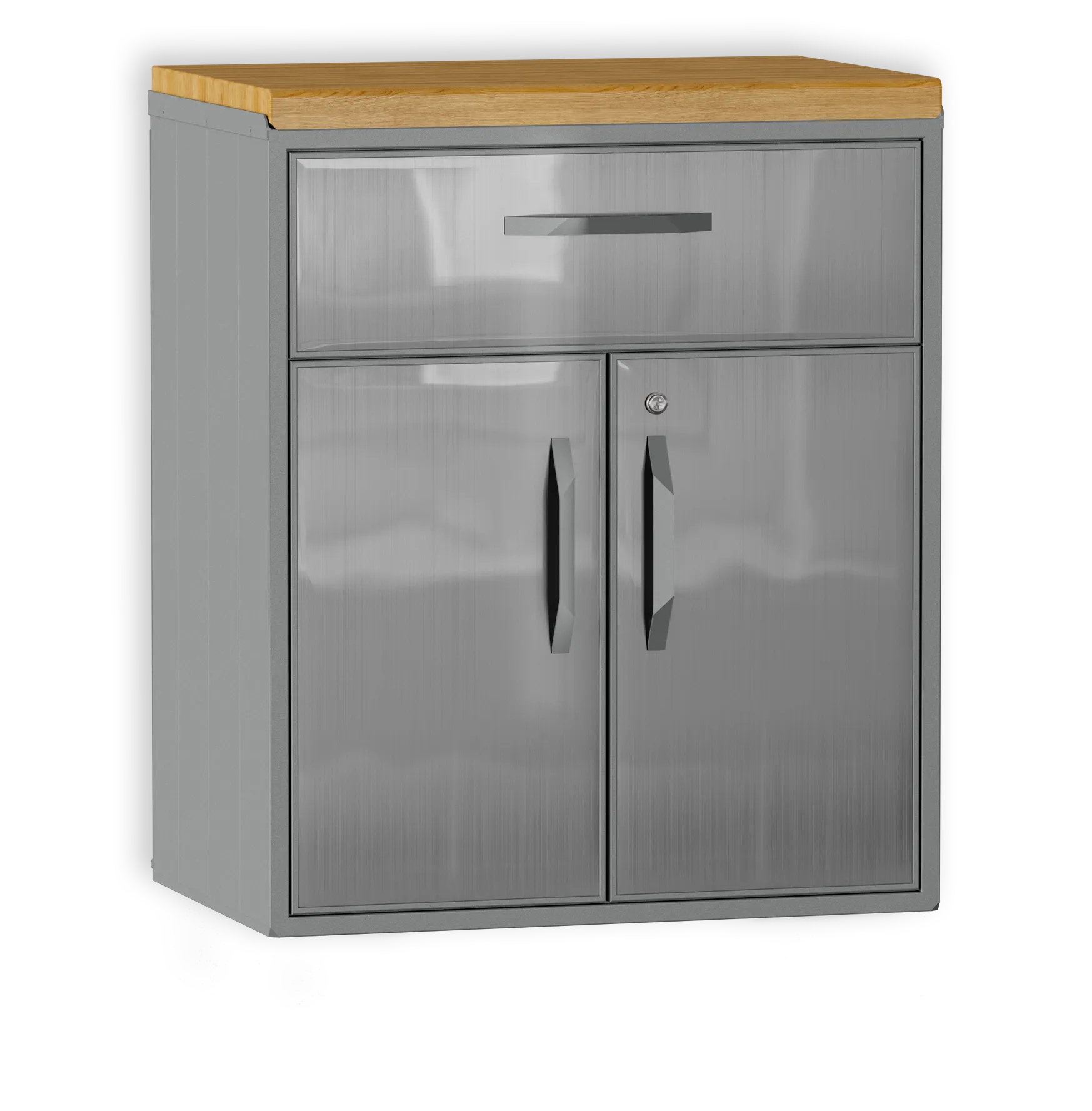 Шкаф из алюминия с ящиком. Специально разработан для любых погодных условий. Внутренняя полка регулируется по высоте. Ящик с доводчиками для плавного бесшумного закрытия.