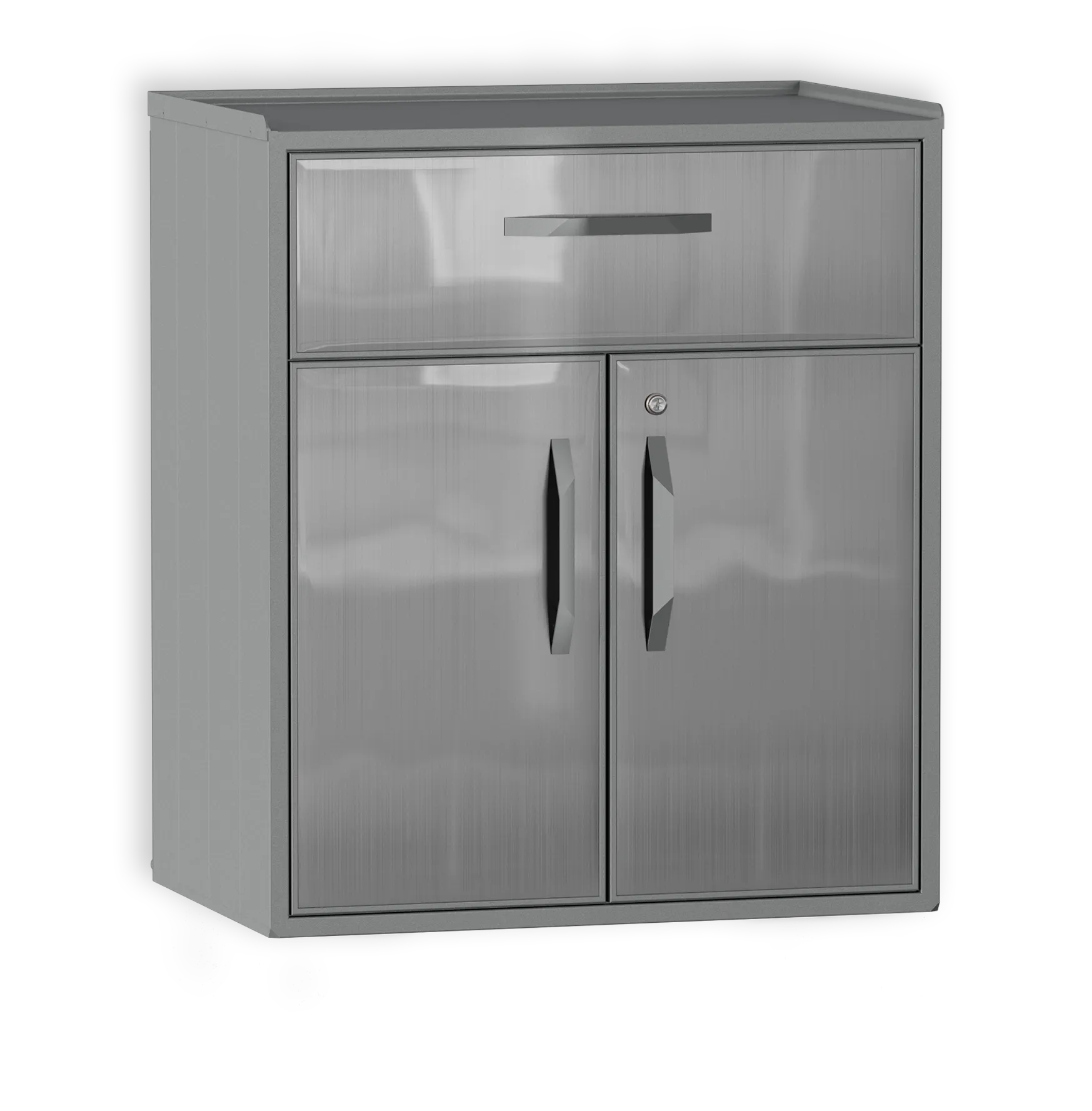 Шкаф из алюминия с ящиком. Специально разработан для любых погодных условий. Внутренняя полка регулируется по высоте. Ящик с доводчиками для плавного бесшумного закрытия.