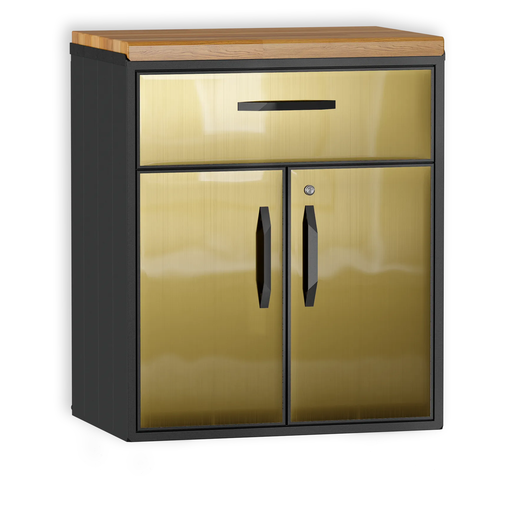 Шкаф из алюминия с ящиком. Специально разработан для любых погодных условий. Внутренняя полка регулируется по высоте. Ящик с доводчиками для плавного бесшумного закрытия.