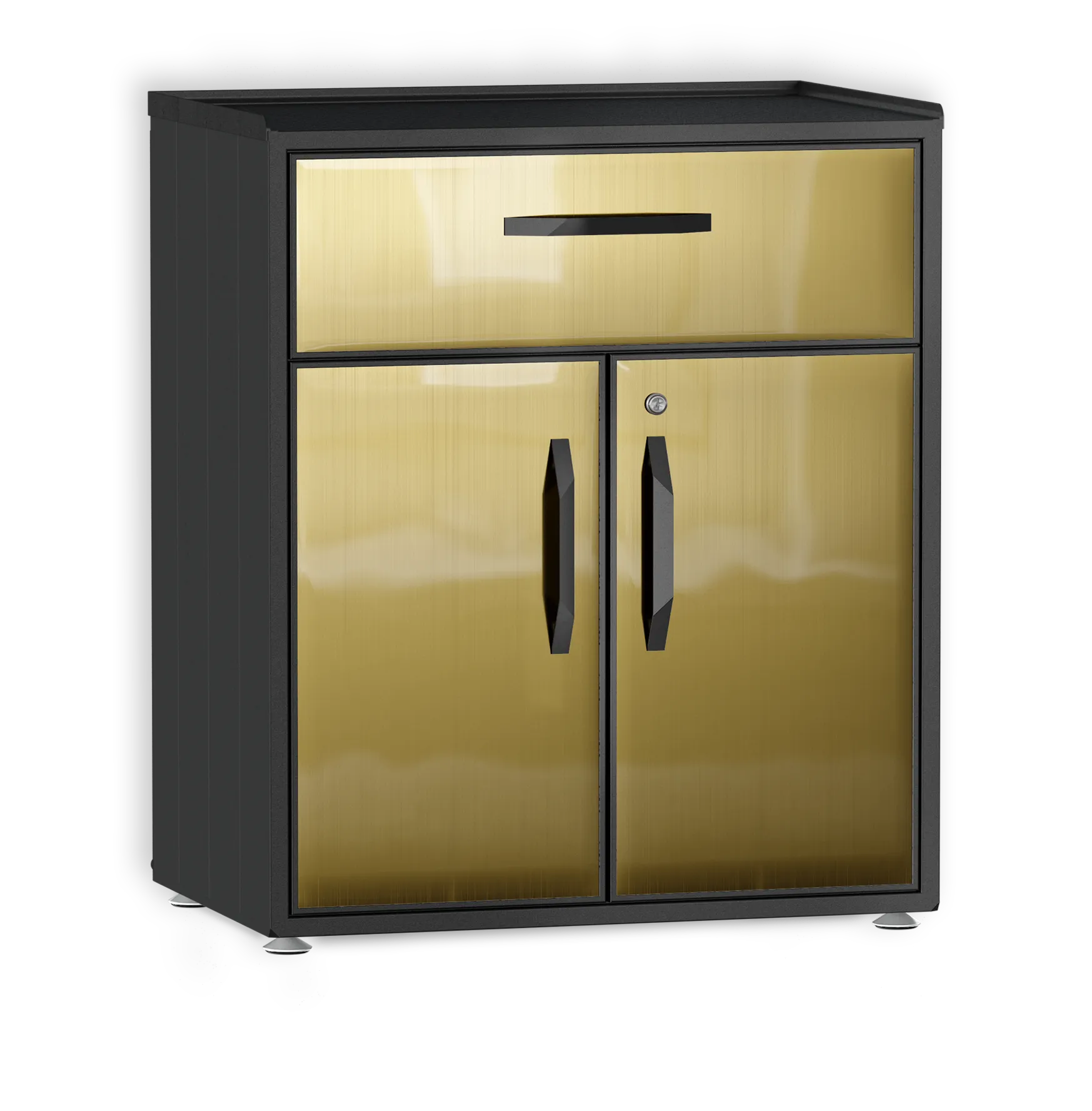 Шкаф из алюминия с ящиком. Специально разработан для любых погодных условий. Внутренняя полка регулируется по высоте. Ящик с доводчиками для плавного бесшумного закрытия.