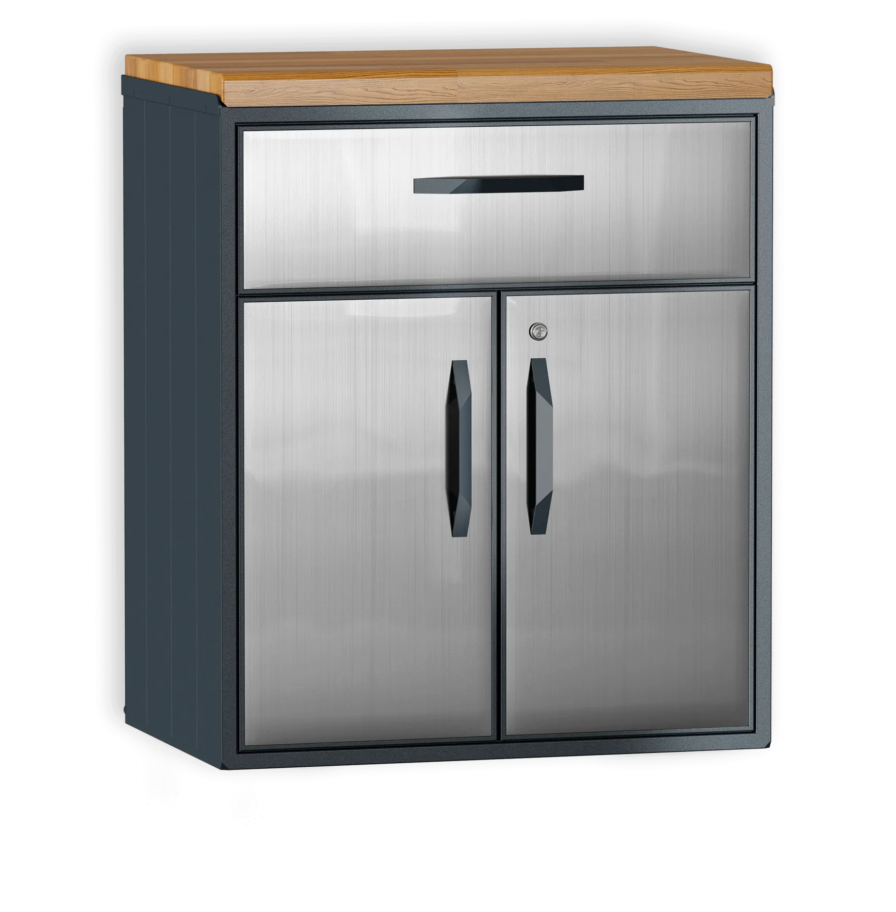 Шкаф из алюминия с ящиком. Специально разработан для любых погодных условий. Внутренняя полка регулируется по высоте. Ящик с доводчиками для плавного бесшумного закрытия.