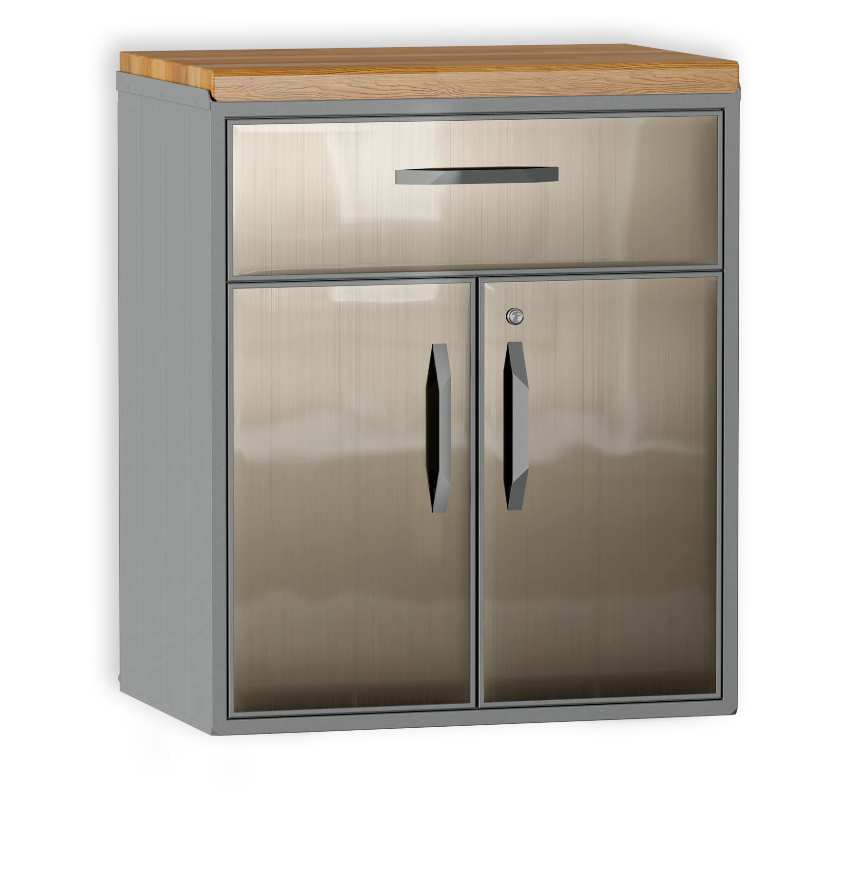 Шкаф из алюминия с ящиком. Специально разработан для любых погодных условий. Внутренняя полка регулируется по высоте. Ящик с доводчиками для плавного бесшумного закрытия.