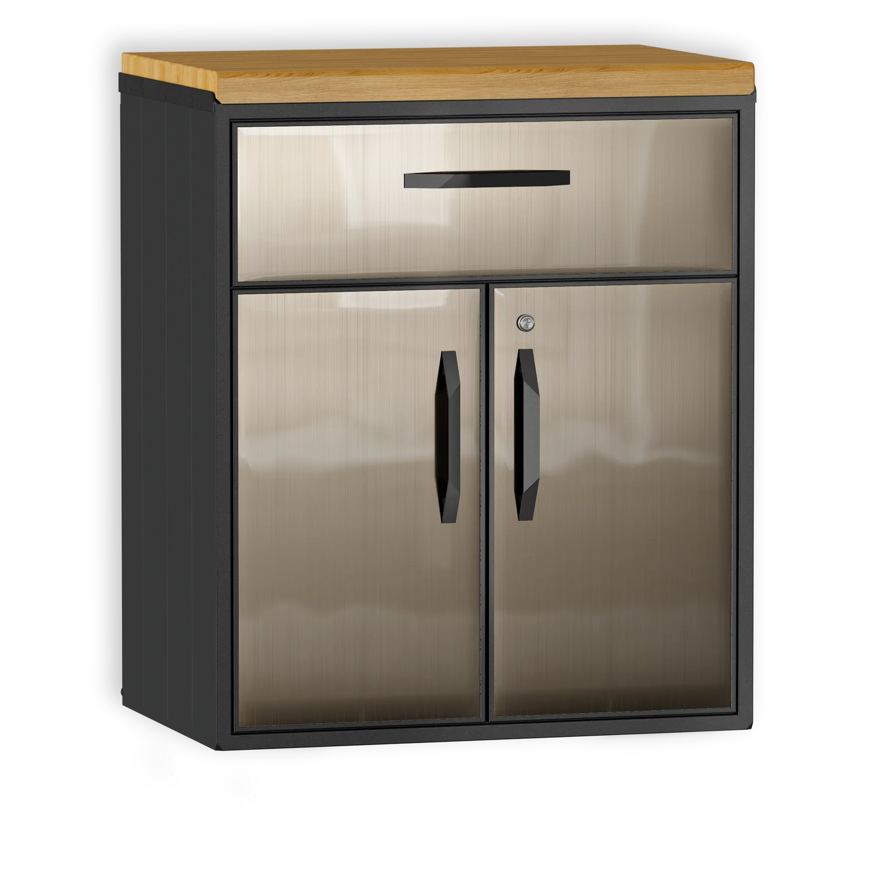 Шкаф из алюминия с ящиком. Специально разработан для любых погодных условий. Внутренняя полка регулируется по высоте. Ящик с доводчиками для плавного бесшумного закрытия.