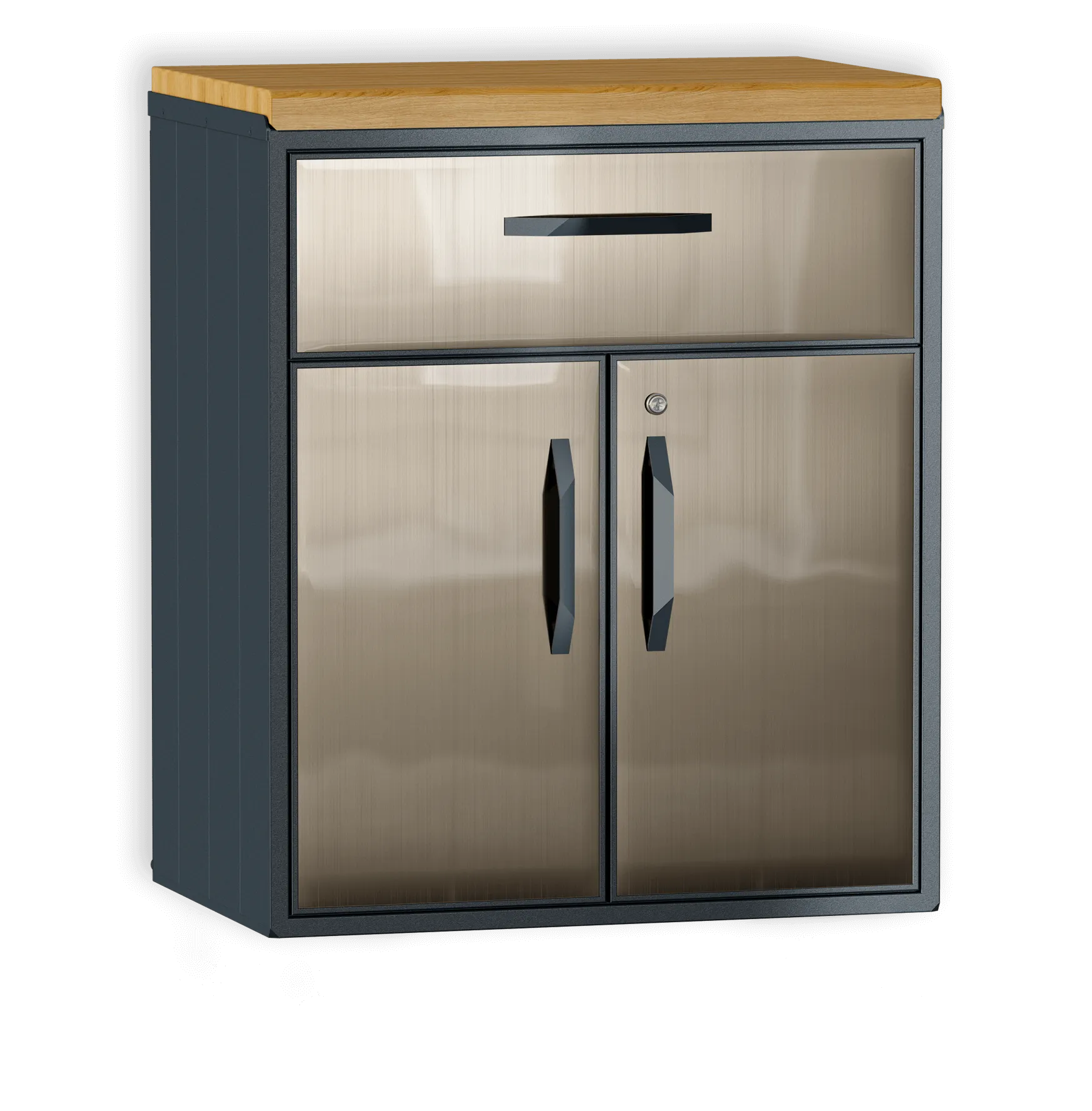 Шкаф из алюминия с ящиком. Специально разработан для любых погодных условий. Внутренняя полка регулируется по высоте. Ящик с доводчиками для плавного бесшумного закрытия.