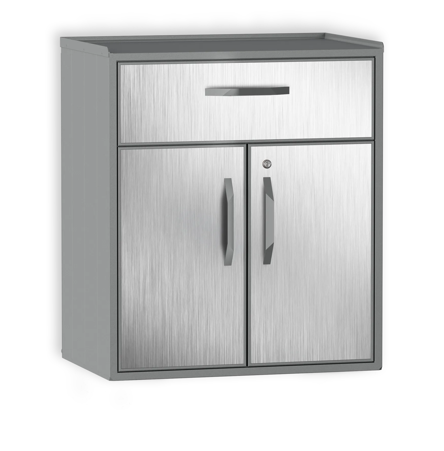 Шкаф из алюминия с ящиком. Специально разработан для любых погодных условий. Внутренняя полка регулируется по высоте. Ящик с доводчиками для плавного бесшумного закрытия.