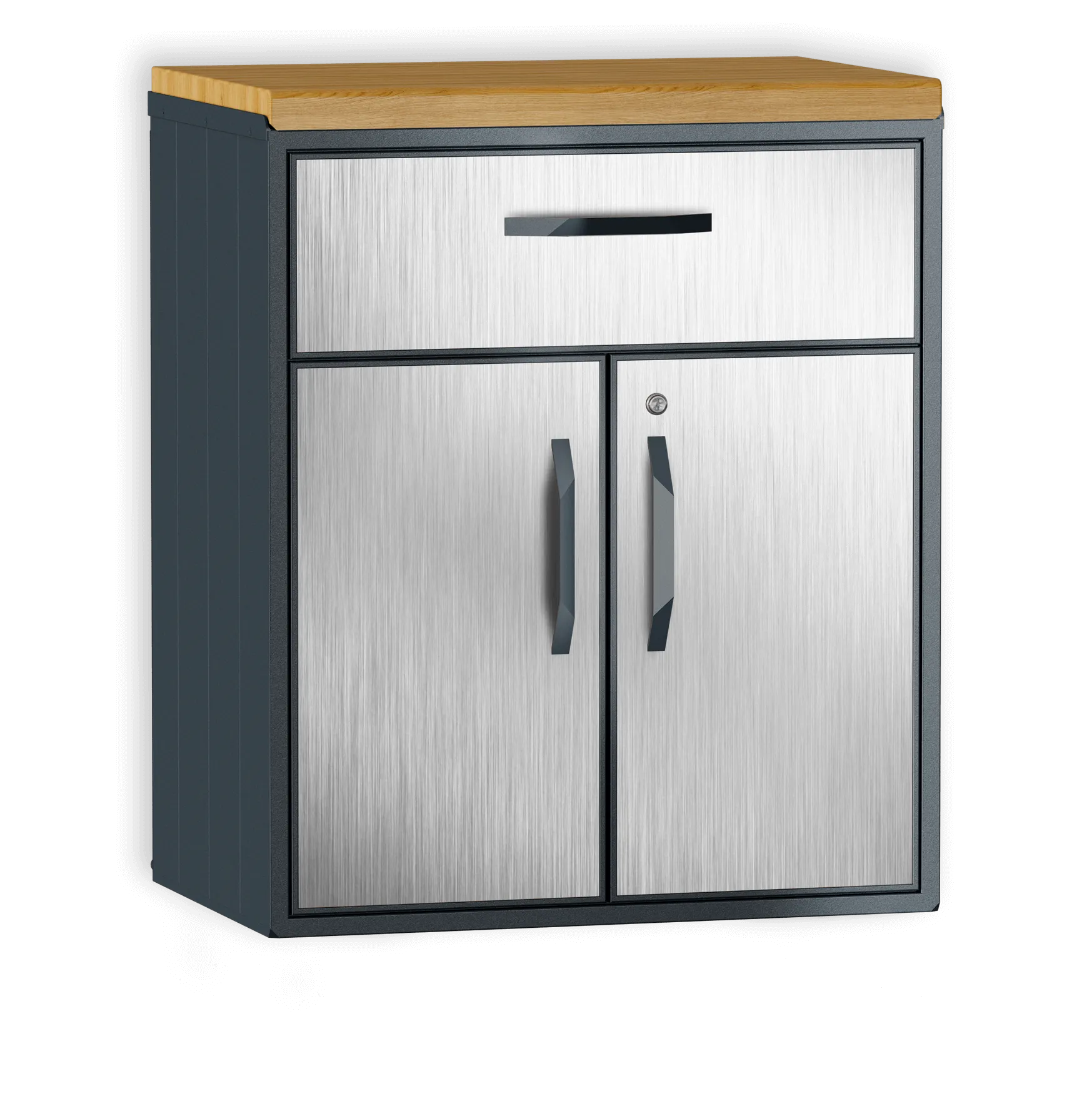 Шкаф из алюминия с ящиком. Специально разработан для любых погодных условий. Внутренняя полка регулируется по высоте. Ящик с доводчиками для плавного бесшумного закрытия.