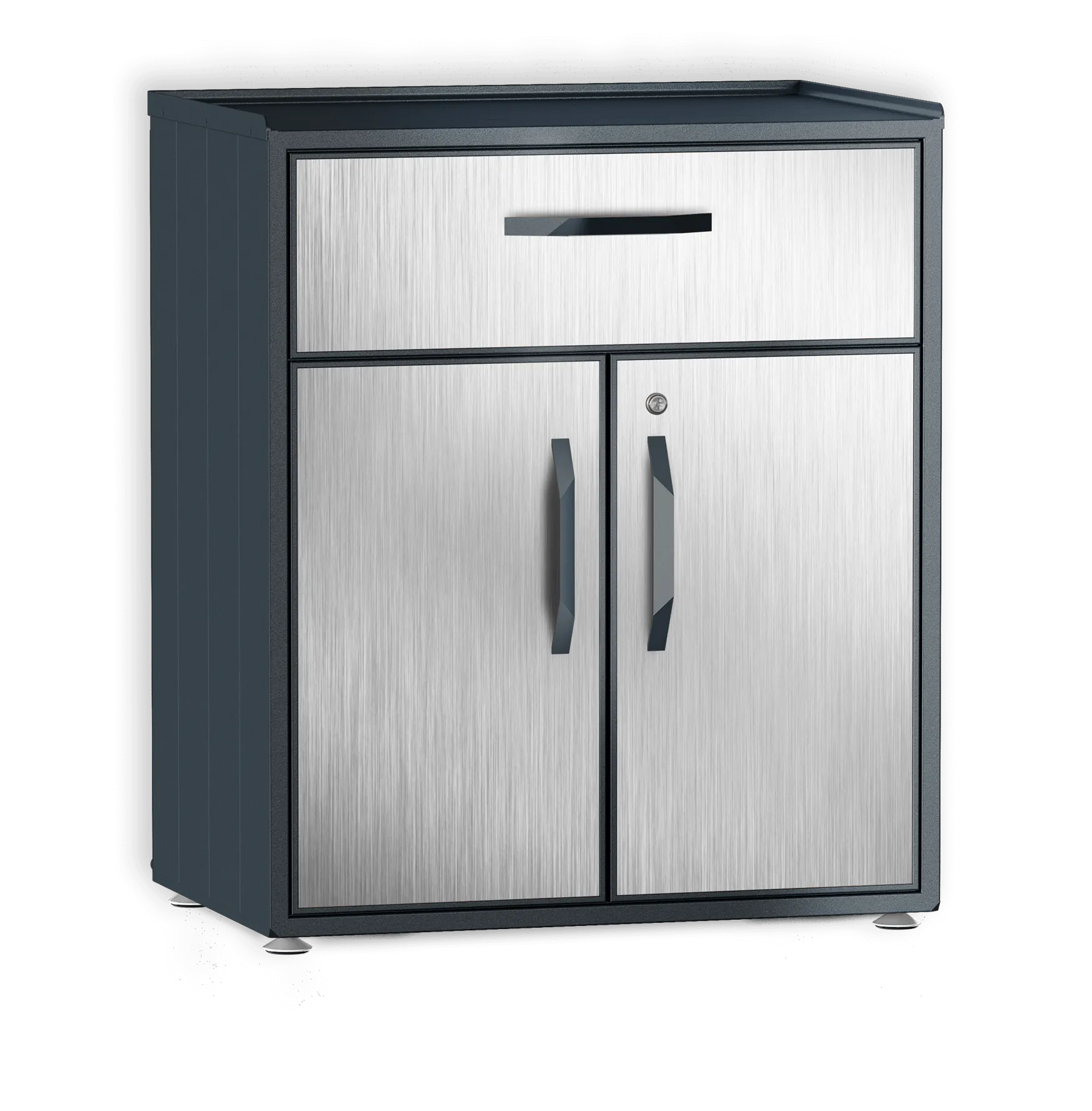 Шкаф из алюминия с ящиком. Специально разработан для любых погодных условий. Внутренняя полка регулируется по высоте. Ящик с доводчиками для плавного бесшумного закрытия.