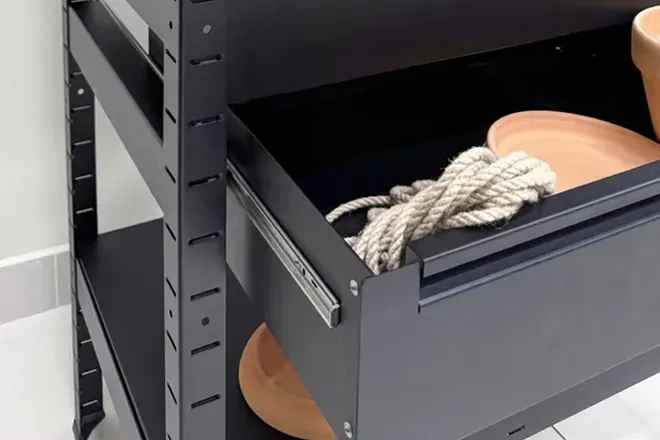 с шагом 50 мм позволит подстроить стеллаж под любые нужды.