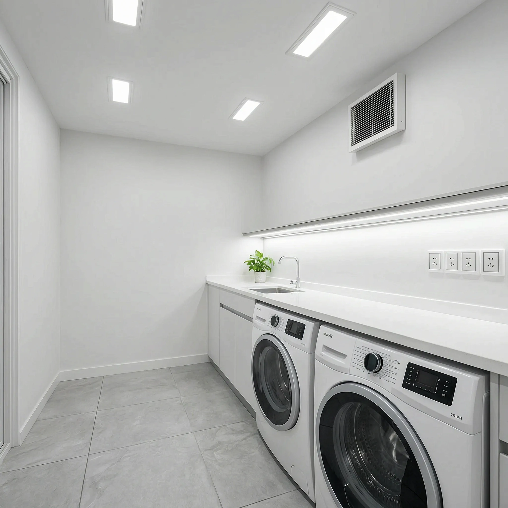 Выключатели: размещайте у входа в прачечную на стандартной высоте 90 см. Для вытяжки удобен отдельный выключатель или автоматический режим. Сенсорные выключатели практичны — их легко включать даже с занятыми руками.