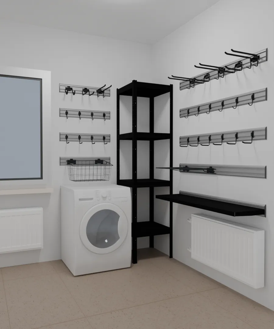 - Крючки и штанги — для развешивания одежды сразу после сушки или для хранения хозяйственных сумок.