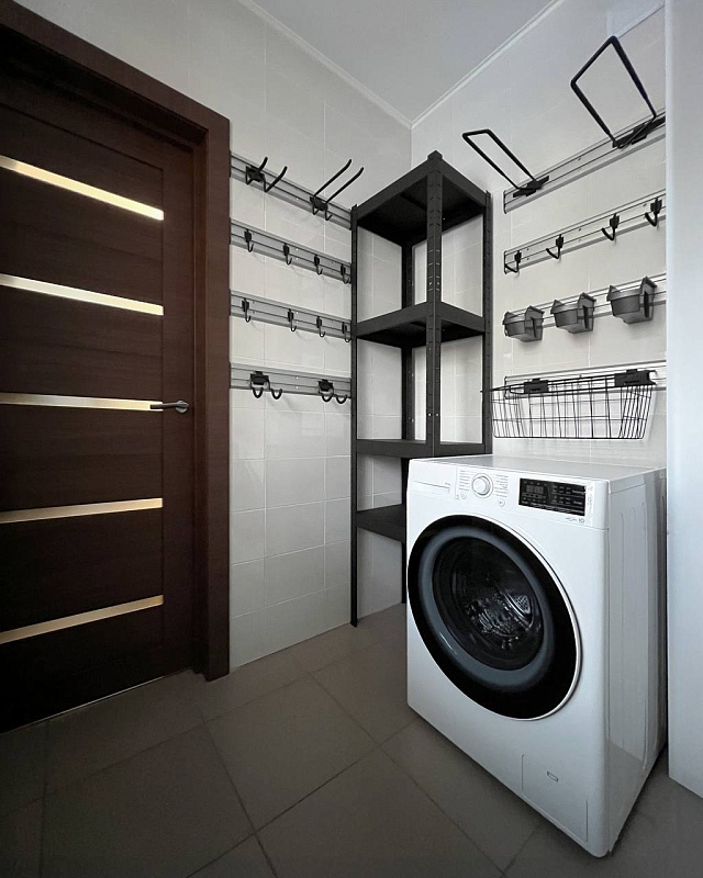 В домашней прачечной можно установить шкафы и системы хранения специально под моющие средства, порошки, кондиционеры и хозяйственный инвентарь. Всё находится под рукой и при этом скрыто от глаз. В ванной или на кухне такой возможности обычно нет — там каждый квадратный метр на счету.